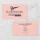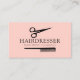 A business card for a professional hairdresser in pink tones featuring illustration of scissors and comb over with modern and stylish font. Perfect for hair salon or barber.