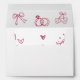Hand drawn pink and white scribble whimsical retro French Parisian style wedding envelope. It features a bow on the flap and hand-drawn illustrations of several whimiscal doodles including hearts, a ring and a bow in magenta pink on the inside. The handwritten font adds a delightful touch, perfectly reflecting the joy and excitement of your special day while inviting your guests in a unique and quirky manner.