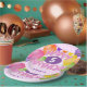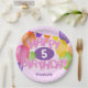 These fun and colorful birthday party paper plates feature the message, "Happy Birthday" spelled out in whimsically arranged realistic pink frosted cutout cookies surrounded by multicolor balloons and bunting flags - child's age and name can be personalized - background is a pattern of small white polka dots on pale pink - by katz_d_zynes