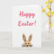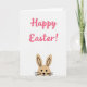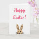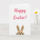 This greeting card features a white background with “Happy Easter!” placed across the upper area in fuchsia lettering with smooth, rounded strokes. The bright text stands out strongly against the open space, giving the layout an airy, modern look. Near the bottom edge, a tan bunny peeks up as if leaning in for a friendly hello, adding a sweet, companionable touch 🐰. Its long pointed ears are outlined in black, and the simple dot eyes and tiny triangular nose create a gentle, inviting expression. Thin black whiskers extend from its face, like it’s edging closer to share the moment with someone special. The overall scene stays minimal, letting the pink greeting and the bunny’s curious gaze do most of the talking 🌷. The bunny is shown only from the upper half, rising from the lower border with its ears reaching upward into the empty white space.
