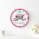 Cute camper or RV themed "Glamper" wall clock. Created with an image of a retro pink glamper style travel trailer scene and flamingo on a pink floral background. Add your own personal text. See other items in this same collection at Camp_and_Cottage on Zazzle.