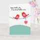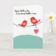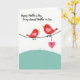 This greeting card shows two small red birds perched close together on a thin black line, their bodies angled as if sharing a quiet, affectionate moment ❤️. Each bird has a soft pink patch on its wing and a bright yellow beak that stands out against the white background. One bird dangles a pale pink heart from its leg, like a shy little gift offered to the other. Beneath them, a gently curved hill in pastel teal adds a calm outdoor touch and keeps the scene feeling light and open. Near the top, a flowing line of text is placed overhead in a dark color, leaving plenty of white space around it. The simple shapes and close spacing between the birds make their connection feel tender and friendly without needing extra details 🌼. The pink heart hangs just above the teal hill, centered under the birds on the white field.