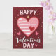 This card shows a deep red background sprinkled with tiny gold stars, pale pink dots, white dots, and little heart specks that feel like confetti in the air ❤️. In the center sits a large soft pink heart with gentle shading, giving it a slightly raised look, and several thin white horizontal lines across it like a note space. Tucked inside that big heart is a smaller, darker red heart, adding a cozy, close-to-the-chest touch 🥰. The words “HAPPY Valentine’s DAY” wrap around the heart, with “HAPPY” near the top and “DAY” near the bottom in rounded letters filled with small dots. “Valentine’s” runs across the middle in smooth, flowing white lettering that stands out against the pink heart. The mix of dotted letters and flowing lettering feels like two styles leaning toward each other, like a sweet exchange between friends or partners. The overall palette stays in reds, pinks, and white with glitter-like gold accents scattered across the background.