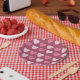 Some raspberry red paper plates with a fun pink heart pattern .