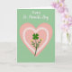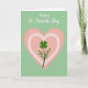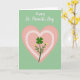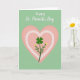Designed with a soft mint-green background that has a lightly mottled texture, this St. Patrick’s Day illustration centers on a large blush-pink heart that looks like felt or worn paper. A dashed brick-red stitch line traces the heart’s edge, giving it the look of a carefully sewn keepsake, like something you’d tuck away from a close friend. Inside the heart, a white lace-like border curls neatly around the center, adding a gentle, old-fashioned touch that feels like a quiet hug 💚. Rising from the middle is a shamrock plant with a rich green stem that ends in a classic four-leaf clover, leaning upward as if reaching toward someone just out of frame. Two small yellow blossoms sit along the greenery, like little shared moments that brighten the scene without stealing attention ☘️. The words “Happy St. Patrick’s Day” appear above the heart in white lettering, centered and airy against the mint background. The heart’s stitched outline, the white lace border, the green clover, and the two yellow flowers stand out clearly against the pale mint field.