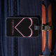 This luggage tag design features a pink heart shape outline, along with a personalized name, on a black background.