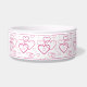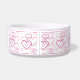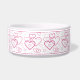Destei's lovely pattern of pink color heart shapes in different sizes. The hearts are drawn as line art making them hollow and letting the white ceramic background color show through. The top and bottom have pink color borders and there is a personalizable text area for a name or other custom text. This is a delightful design for anyone who adores their pet, simply likes the color pink or wants a love theme bowl for Valentine's Day time, for example.