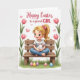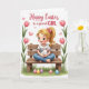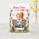 This card features a soft digital illustration of a wide-eyed young girl with light blonde hair in a ponytail, tied with a small pink bow, sitting cross-legged on a rustic wooden bench. She holds a fluffy white bunny close 🐰, and her rosy cheeks and gentle smile suggest a sweet bond, like a quiet moment shared with a close friend. Pink blossoms rise along both sides of the scene, and tiny pink hearts float nearby, adding a romantic touch without taking over the picture 🌷. Along the bottom, a strip of rich green grass is sprinkled with pastel oval decorations in soft pinks, blues, and yellows. The background stays light and airy, letting the pastel palette stand out and keeping the focus on the pair at the center. A short Easter greeting is placed near the top in a flowing dark-pink style, centered above the girl and bunny. The blossoms form a loose frame around the bench, while the decorated ovals sit clustered across the grass in the foreground.