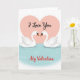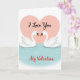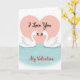 This Valentine's Day card shows two white swans gliding on calm, light blue water, facing each other so closely their curved necks nearly meet, giving the scene a quiet, romantic pull 🥰. Their bodies are drawn with simple, smooth shapes, and their small black eyes and soft orange beaks add just enough detail to make their gaze feel tender. Behind them sits a large, soft pink heart like a gentle backdrop that frames the pair as if they’re tucked into an embrace. Centered inside the heart, the words “I Love You” appear in flowing black lettering that stands out against the pale pink. Near the bottom of the design, “My Valentine” is placed below the water scene in bright red flowing lettering, adding a clear splash of color ❤️. The pastel palette stays light and airy, with the pink heart and blue water balancing the swans’ crisp white feathers. Subtle ripples in the water sit beneath the swans, and the big pink heart fills most of the upper background.