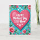 Designed with a large plush-looking pink heart centered on a bright turquoise background, the illustration sets a warm, friendly tone ❤️. A dashed white stitch line traces the heart’s edge, giving it a cozy fabric-like look that feels like a gentle hug. Inside the heart, a short Mother’s Day message appears in crisp white lettering, centered and easy to read. Around the heart, leafy green branches and textured foliage curve inward like an embrace, creating a natural frame that suggests closeness and care. Clusters of pink flowers in several shades bloom along the sides and corners, some with small yellow centers, alongside tiny white and pale pink blossoms for softer contrast 🌼. Near the upper area, a few small white hearts float upward, adding a light, affectionate touch without crowding the main message. The flowers and leaves form a loose border that guides the eye back to the center, while the turquoise background stays smooth and even. The central heart is fuchsia-pink with white stitching and white text, surrounded by green leaves and pink-and-white flowers against the solid turquoise field.