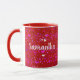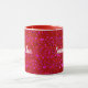 A handwritten, personalized name of your choice is set against a playful background of tiny foil pink hearts and dots on red glitter. Spread love and joy whenever you drink out of this colorful, stylish and modern custom name coffee mug. This is a great gift for Valentine’s Day, birthdays, anniversaries, engagements, or for an anytime “I love you” gift. Send this to someone special!