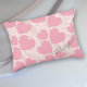 This pretty personalized pillow for her has a pattern of pink hearts against a background of faded ribbon swirls and stars. Your custom text is in silver gray at the bottom right. The other side of the pillow has the same image pattern, but without the text.