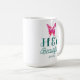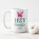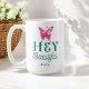 Green Pink Coffee Mug | Hey/Hello Beautiful Coffee Mug | Quote in Green Typography and Pink Butterfly. Makes an ideal gift for just about anyone including make up artists, salon owners, stylists, girls and for her. | Inspirational Beauty Quote Mug |