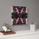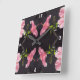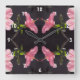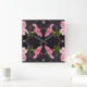 The original artwork on this Square Wall Clock is a soft and gentle piece from the garden, but with the bold contrast of pink and black. The hibiscus flowers, in the original photograph by HomeWare in this lovely pattern, are a rich pink against an almost black background. The photo is a profile of the flowers in full bloom, with ruffled petals and yellow pollen stem. Sunlight shines on the spring green leaves, and a new flower bud emerges. There are white numbers which can be removed if you prefer.