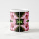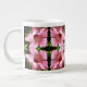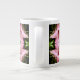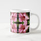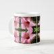 On this giant Mug - Made from an original photograph by HomeWare, bright pink hibiscus flowers are the subject of this original tropical garden pattern with a "country floral" look. There are four beautiful, wide open blooms facing inward from each corner. The flower petals are a very deep pink in the center, gracefully curving outward as the petals change to a lighter pink color. The background is a pattern made up of the shades of natural green in the plant's leaves.