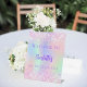 A welcome sign for a girly and glamorous Quinceanera. A trendy holographic colored background in pink, purple, mint green. Decorated with confetti in pink. Personalize and add a name. Purple text.