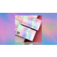 A trendy holographic background with unicorn colors and rainbow colors in pink, purple, mint green.