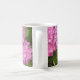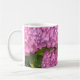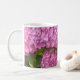 A great coffee mug for a gardener or nature lover. Stunning pink hydrangeas with bright green foliage accent this mug.