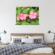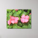 This awesome canvas print features a photograph of two pretty pink impatiens flowers and the surrounding foliage. The petals shine and the leaves are wet from a rainstorm.
