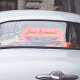 Pretty wedding window cling that looks like a pink and gold banner, with custom text reading Just Married! Perfect for the back window of the newlywed's get away car.