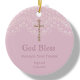 Celebrate the special moment of your little one's baptism with our beautiful pink lace baptism keepsake ceramic ornament. Featuring a stunning gold tone crucifix and delicate lace effect on a dusty pink background, this ornament is a perfect way to commemorate the special day. It is ready for easy personalization with your child's name and the date of their baptism. This keepsake will be treasured for years to come and is a meaningful way to remember your child's baptism.