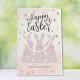 Celebrate Easter with this charming card featuring three elegant bunnies adorned with intricate lace patterns and soft pink bows. Set against a whimsical backdrop of golden stars and a gentle watercolor wash, this design exudes warmth and joy. Personalized with a family name or custom text, it becomes a unique keepsake for your loved ones. Order today to add a festive touch.