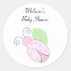A cute design featuring a soft pink ladybug on a leaf, customize with baby shower information as desired.