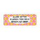 These return address labels have a geometric design of repeating pink and orange triangles with yellow circles on top on a field of off-white. Want the same design in different colors? Message me.