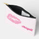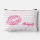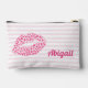 NewParkLane - Cute Personalized Accessory Pouch / cosmetic bag,, with your name in fun, handdrawn typography, and a pink leopard print kiss, against a blush pink striped background.