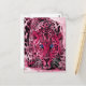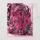 Bright blue eyes. On a wild cat with pink and black and white spots. He is resting on all four paws. Looking at you. With his eyes open wide. On this unique postcard