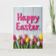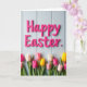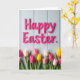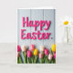 The front design shows a tall layout with raised hot pink letters near the top spelling out a classic Easter greeting, set against a pale blue background that looks like vertical wooden panels. The letters have a smooth sheen, and soft lighting creates gentle shadows that make them feel close and touchable. Under the text, a wide band of tulips stretches across the lower third like a bouquet offered between close friends, with the flowers leaning toward one another in a cozy cluster 🌷. The tulips come in fuchsia, sunny yellow, creamy white, and blush pink, with deep green stems and broad leaves grounding the scene. Some of the lighter petals include tiny dark speckles that add extra texture, like little sprinkled dots scattered here and there. The greeting sits centered at the top in hot pink, while the floral band runs horizontally below, leaving airy blue space in between for balance 🐰. Pale blue planks form the background, and the tulips line the bottom edge in a neat row with a few petals overlapping.