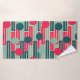This towel set has a mid-century modern design of repeating rectangles in pink, teal, and blue with circles layered on top.