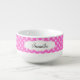 This soup mug features and trendy pink polka dot pattern accented with a white swirly frame on the front and customizable text for personalization.