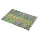 THESE PLACEMATS FEATURE A PHOTO OF SEVERAL PINK LOTUS BLOSSOMS WHOSE REFLECTIONS ALONG WITH THOSE OF TREE TRUNKS ALONG THE BANK ARE VISIBLE IN THE WATER IN A "SORT OF" MONET STYLE.