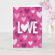 This Valentine's Day card features the word “LOVE” centered in large white letters, and the “O” is replaced by a white heart. The letters look like simple sans‑serif type, and a soft shadow under them gives a slight raised look. Behind the word, the whole background is deep fuchsia and filled with many hearts scattered all over. The hearts come in different sizes and shades of pink, from light blush to darker magenta and berry tones. Some hearts overlap a bit, which makes the pattern feel like confetti floating around the message. There aren’t any characters, but the heart shapes and strong color contrast make the card feel warm and romantic