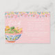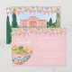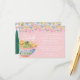 This destination wedding details enclosure card features painted artwork of papel picado on the top edge and a pink suitcase in the lower corner. On the back is a Mexican hacienda surrounded by tropical flowers. All the important wedding details can be personalized. Colors include green, pink, white and coral.