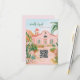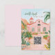 This destination wedding response card features painted artwork of a Mexican mission surrounded by tropical flowers with a QR code. All the important wedding details can be personalized. Colors include green, pink, white and coral.