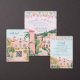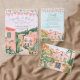 This destination wedding invitation features painted artwork of a Mexican desert beach scene. All the important wedding details can be personalized. Colors include green, pink, white and coral. Text in green.