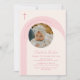 Pink Modern Boho Arch Cross Girl Photo Baptism Invitation