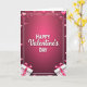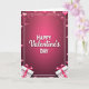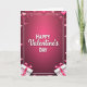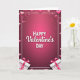 This greeting card features a bright pink background that fades from deep fuchsia near the edges to a lighter pink in the middle. In the center, the text reads “HAPPY Valentine’s DAY” in white, with “HAPPY” and “DAY” in simple sans‑serif letters and “Valentine’s” in a flowing cursive style. A thin double-line border frames the message and helps it stand out. Around the edges, glossy pink hearts in different shades look like they’re floating, with a soft shine that makes them feel slightly 3D. Curly ribbon shapes twist near the top corners, adding a fun, romantic touch. At the bottom left and right corners, two white gift boxes with fuchsia polka dots peek in, each topped with a matching bow, which adds a sweet “gift” feel. It’s a cheerful, love-filled design that’s perfect for a partner or a close friend