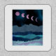 This gorgeous abstract landscape depicts a nighttime mountain scene with a bold pink moon shown in phases arcing over the sky. The design uses blue, cyan, pink, and grey colors.