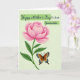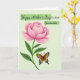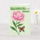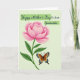 This card features a large blooming flower in soft-to-deep pink tones, with many layered petals that look velvety and full of life. A curved green stem with leafy sprigs rises from the upper left, letting the blossom spread gently across the space like it’s leaning in for a quiet hello. Below the flower, a butterfly-like insect rests with wings open wide, showing warm brown sections edged with bright blue and golden yellow details, as if dressed up for a sweet moment ❤️. The pale green background is lightly textured with fine diagonal lines, giving the scene a calm, airy setting without stealing attention from the main artwork. Near the top, the message sits inside two soft green banner shapes, with the lettering in a darker green so it stands out clearly. The way the flower hovers above the little visitor creates a tender, friendly closeness, like a shared pause in a garden 🌼. The insect’s patterned wings show electric-blue patches and small golden accents against the muted green backdrop.