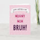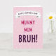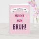 This greeting card features a soft pastel pink background sprinkled with lighter pink polka dots 🌼. Near the top, a white banner with a dashed outline holds the words “HAPPY MOTHER’S DAY” in dark charcoal lettering. Below it, the word “MUMMY” appears first, but it’s crossed out with two large fuchsia X marks, like someone teasingly changing their mind. Under that, “MUM” gets the same fuchsia X treatment, adding a cheeky, affectionate back-and-forth ❤️. The final word, “BRUH!”, is set larger in a deep plum color with a sharp exclamation point, giving the layout a friendly, joking tone like a grin shared between close family. The text is stacked down the center, with each line spaced to feel like a quick progression of thoughts. The banner stays crisp and neat while the fuchsia X marks look loose and hand-drawn, standing out against the dotted pink backdrop.