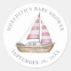 This nautical-themed baby shower sticker features a charming sailboat at the center, bringing a classic ocean-inspired touch to your celebration. The mother’s name and "Baby Shower" are displayed at the top, while the date is featured at the bottom in a mix of classic serif and modern typography.