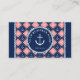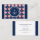 Nautical business card with a pattern of anchors and ship's wheels in white against navy blue and pink tiles framed with a rope illustration. Add your business name inside a rope-circle framing a white anchor, and the year your business was established.