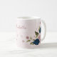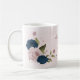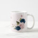 Beautiful romantic coffee mug featuring navy blue pink flowers and some pretty leaves .