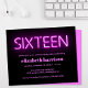 Cool budget-friendly invitation for her 16th birthday party with "sixteen" in hot pink glowing neon lights against a black background.