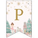 This pastel Nutcracker ballet birthday bunting flag sets the tone for your girl winter wonderland theme birthday celebration. The ODILE Collection has a soft pink background with Nutcracker ballet faves from the Sugar Plum Fairy, the Nutcracker in pastel pink, a rocking horse toy, Christmas tree, wrapped gifts, ballet point shoes, pink poinsettias, and soft mint green winter greenery. Serif font in gold spells out HAPPY BIRTHDAY.