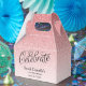 This beautiful favor box features faux pink ombre glitter and your custom text along with the word Celebrate in fancy script. Use the template form to add your information. The Customize feature can be used to change the font and the text layout. You can also add text to the other side of the favor box.