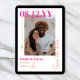 Modern save the date card in white with pops of color in pink, orange, and pear green with your photo, your wedding date and an elegant narrow arrow.
